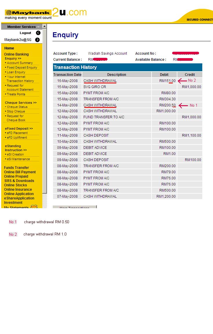 22 May 2008 Berhubung perkara di atas, saya ingin mendapatkan info dan maklumbalas dari bank negara. Masalah: Saya ada membuat cash withdrawal ATM maybank dengan kad ATM maybank. Selepas keluaran kali ke 4, maybank mengenakan charge spt berikut; 1. Keluaran kali ke 5, maybank charge saya RM0.50 2. Keluaran kali ke 6 maybank charge saya RM1.0